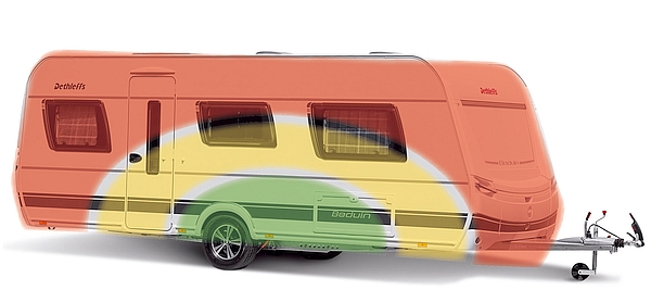 Die beiden Darstellungen von Reisemobil und Caravan machen deutlich, wo in welcher Fahrzeugart schwere Ladung am besten verstaut werden sollte. Im grünen Bereich fallen eventuell negative Auswirkungen auf Fahrverhalten und Fahrsicherheit am geringsten aus. Die gelbe Zone sollte hingegen nur bedingt genutzt werden, und im rot gekennzeichneten Bereich verstaut der Profi wirklich nur Leichtes, Kleidung etwa. Das passt in der Regel auch ganz gut zur Möbelanordnung: Oben die Dachstauschränke für Wäsche und Oberbekleidung bis hin zum Küchenblock, wo Schweres wie Proviant, Geschirr und Kochutensilien verstaut werden. Diese Zonen sollten auch bei der Nachrüstung schwerer Bordtechnik wie Batterien oder größerer Tanks berücksichtigt werden. Im grünen Bereich ist diese bestens aufgehoben.