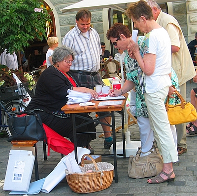 Ein Ziel dieser ver.di-Aktion war nach Darstellung Jungtäubls, die Passanten in Gesprächen und mit Flyern zu informieren und Unterschriften für die Stärkung der gesetzlichen Rente zu sammeln, um diese dann über den Dachverband DGB an den Bundestag weiterzugeben.