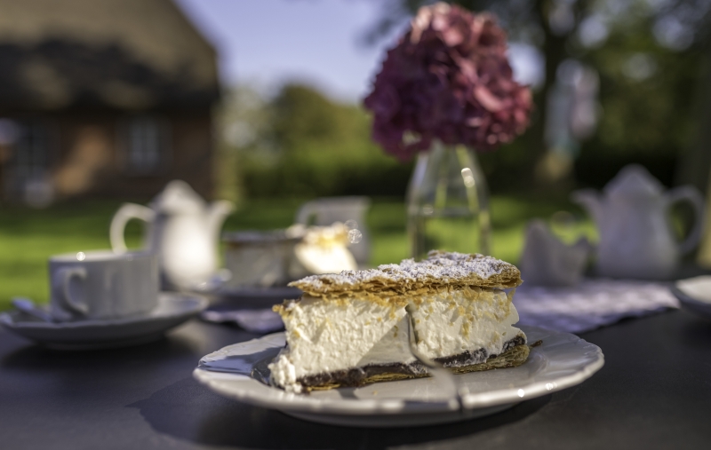 Die Friesentorte natürlich, den Klassiker aus Blätterteig, Sahne und Pflaumenmuß. Aber auch Friesenwaffeln – aus Mürbeteig und mit dem Waffeleisen im Café gebacken. Dazu, beispielsweise, hausgemachte rote Grütze den norddeutschen Nachtisch schlechthin aus Beeren der Saison, hier nach eigenem Rezept (das hat im Norden jede Hausfrau, jeder Konditor) mit Zimt und Kardamom verfeinert (mehr verraten sie nicht). Saisonal auch das Obst: Birnen, Stachelbeeren und Pflaumen gehören hierher. Im Friesencafé gibt es zu gegebener Zeit eine Birnen-Schoko-Lavendel-Quark-Torte, einen Pflaumenstreusel oder Stachelbeere auf Biskuit mit Vanillecreme. Ohne Chichi, einfach gut wie immer schon. Schlicht und schön ist das modernisierte Café, gehalten hauptsächlich in den Farben weiß und blau. So, wie die Strandkörbe auf der Terrasse. Im Gastgarten blühen die Hortensien bis in den Herbst und der Jasmin duftet so schön nach Sommer.