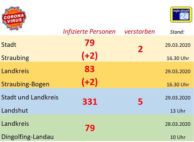 (ra) In den vergangenen 24 Stunden gab es im der Stadt Straubing und im Landkreis Straubing-Bogen je zwei neue Infizierungen mit dem neuartigen Corona-Virus. Insgesamt gibt es demzufolge in der Stadt 79 Fälle und im Landkreis 83 infizierte Personen (Stand: Sonntag, 16.30 Uhr).
