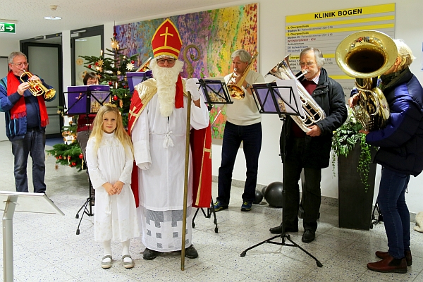 (ra) Aus all den weißen Kitteln an der Klinik Bogen leuchtete am Dienstagnachmittag der rote Mantel des Heiligen Nikolaus ganz besonders hervor. Schon von weitem konnten die Patienten in ihren Zimmern den hohen Besuch kommen hören, da der Posaunenchor der Evangelischen Kirche in Bogen ihn mit stimmungsvollen Adventsliedern begleitete: