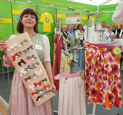 Zur Messezeit gibt es am ZAW-Stand nicht nur Infos zur Altkleiderverwertung, sondern auch Mitmachaktionen: Besucher können sich am beliebten Recyclingtisch ihre eigene Volksfest-Schleife binden – für Dirndl, Frisur, Handtasche oder als Fliege. Außerdem präsentieren die Mitarbeiterinnen Dragana Steiger und Barbara Zwerger handgefertigte Dirndl-Schürzen aus gebrauchten Stoffen. Jede ist ein Unikat mit eigener Geschichte. Für Herren gibt es passende Einstecktücher. Nach der Messe werden die Schürzen verlost – wer mitmachen möchte, kann einfach per E-Mail seine Lieblingsnummer angeben.