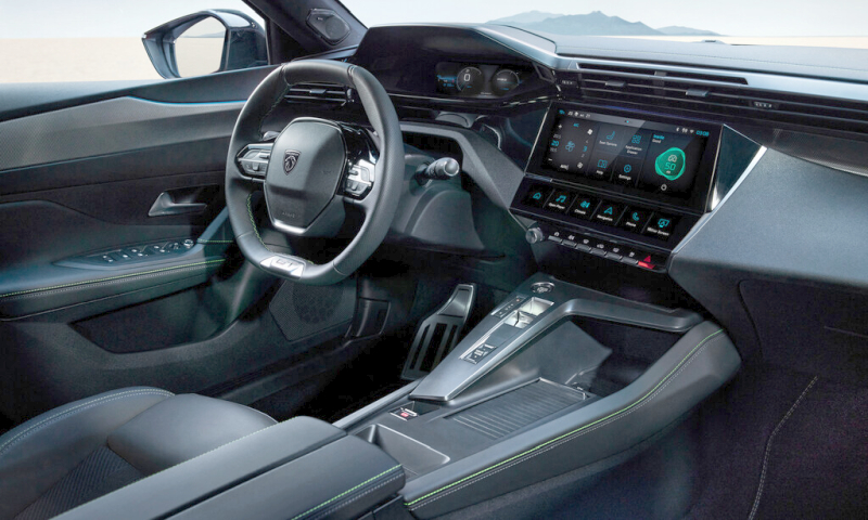 Innen bietet der 408 die neueste i-Cockpit-Generation, nach wie vor mit dem kleinen, tief sitzendem Lenkrad. Es wird optional beheizt und beherbergt die Bedienelemente für das Multimedia- und einige Fahrerassistenzsysteme. Ab Ausstattungsvariante Allure gibt es ein digitales Kombiinstrument mit 10-Zoll-Digitalbildschirm, das in der Topversion GT auch in 3D-Technologie zu haben ist. Auch der zentrale Multimedia-HD-Touchscreen ist zehn Zoll groß, kann frei konfiguriert werden und lässt sich wie ein Tablet durch Wisch-und-Weg-Gesten bedienen. Daneben gibt es aber auch noch so genannte „i-Toggles“, die wie ein offenes Buch angeordnet sind. Über diese berührungsempfindlichen Tasten können Klimaeinstellungen, Telefon, Radiosender oder eine gespeicherte Anwendung direkt abgerufen werden.