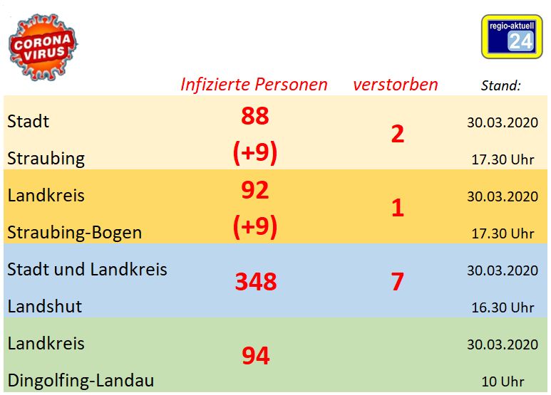 (ra) Die Zahl der Todesopfer aus Stadt und Landkreis Landshut, bei denen ein Zusammenhang mit COVID-19 möglich ist, ist über das Wochenende auf insgesamt sieben Menschen angestiegen. Auch im Landkreis Straubing-Bogen verstarb ein Mann, der mit dem Virus infiziert war.