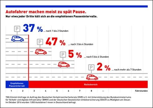 Autofahrer sind auch im Urlaub flexibel, können mehr Gepäck transportieren und eine Reisepause einlegen, wann immer dies gewünscht ist. Letztere kommt allerdings meist viel zu kurz. Laut einer im Oktober 2016 vom Deutschen Verkehrssicherheitsrat (DVR) beauftragten TNS-Emnid-Umfrage hält sich nur etwa jeder Dritte der befragten Fahrer und Fahrerinnen an das empfohlene Pausenintervall und pausiert nach circa zwei Stunden. Über 50 Prozent legen erst nach drei bis vier Stunden oder später eine Pause ein. In diesem Fall steigt die Gefahr für Müdigkeit am Steuer – ein häufig unterschätztes Risiko.