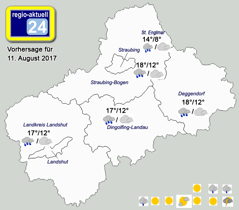 Über ganz Niederbayern zieht in der Nacht zum Freitag eine Regenfront, die sich erst zum Mittag hin beruhigen wird. Entsprechend fallen auch Temperaturen. In Straubing wird das Thermometer nicht über die 18-Grad-Marke hinausgehen. Noch kühler wird es bei 14° C in St. Englmar. Der Himmel wird in den Nachmittagsstunden weiterhin bewölkt sein. Ob für die Straubinger der Volksfestauszug trocken sein wird, kann noch nicht wirklich sicher vorhergesagt werden.
