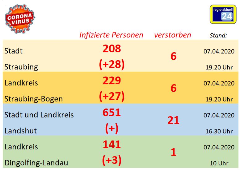 In der Region Landshut wurden bisher 651 Corona-Infektionen festgestellt. Die Zahl der Kontaktpersonen liegt bei 2.660. Bisher sind 21 Infizierte, bei denen ein Zusammenhang mit COVID19 möglich ist, verstorben (Stand: 7. April, 16.30 Uhr). Die Anzahl der nachgewiesenen Infektionen bildet das gesamte Geschehen seit der KW 11 ab, als der erste Corona-Fall in der Region nachgewiesen wurde. Zwischenzeitlich Genesene und aus der häuslichen Quarantäne entlassene Personen (bisher 175) sind noch in der Summe enthalten. Derzeit werden in den Krankenhäusern in der Region Landshut 86 Patienten betreut, die mit dem Corona-Virus infiziert sind, hinzu kommen 21 auf den Intensivstationen (Stand: 7. April, 10.15 Uhr).