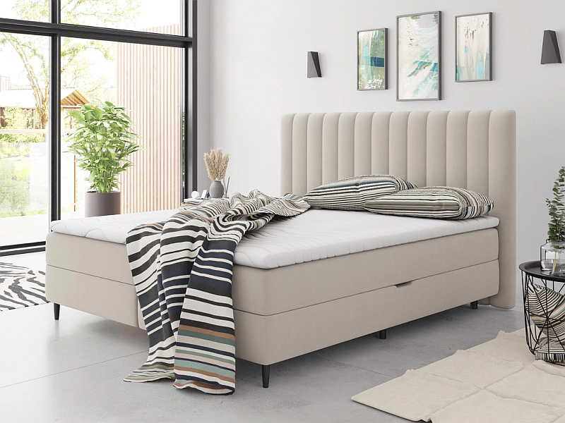 Ein 160 cm breites Bett ist eines der am häufigsten gewählten Modelle in Doppelzimmer, weil es die richtige Breite für bequemen Schlaf bietet. Dank der gepolsterten Oberfläche wird das Bett zum Mittelpunkt des Schlafzimmers und verleiht ihm einen eleganten und gemütlichen Charakter.