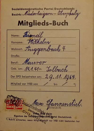 Wie das Mitgliedsbuch von Willi Biendl ausweist, wurde er am 29. November 1964 vom damaligen Ortsvorstand Max Pfannenstiel, seinem Schwiegervater in die SPD aufgenommen.