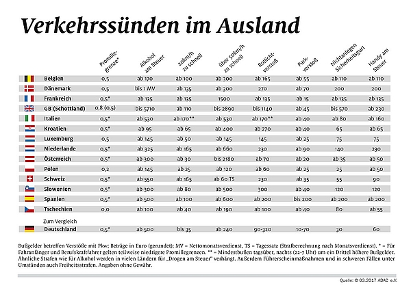 (amp) Mit dem Frühjahr beginnt auch wieder die Reisesaison. Wer mit dem Auto ins Ausland fährt, sollte daran denken, dass Verkehrssünden in anderen europäischen Ländern teils deutlich strenger bestraft werden als in Deutschland. Besonders teuer kommt es deutsche Reisende zu stehen, wenn sie zu schnell fahren, am Steuer telefonieren oder alkoholisiert sind, warnt der ADAC. Urlauber sollten daher die Verkehrsvorschriften des Landes kennen und sich entsprechend verhalten.