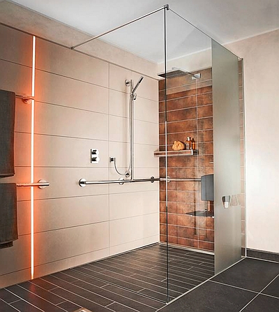 Eine attraktive Akzentbeleuchtung kann das Bad zudem elegant in Szene setzen – mit der Lichtprofiltechnik „Liprotec“ stehen hierfür zahlreiche, mit hochwertigen LED-Streifen beleuchtete Profile zur Verfügung. So können zum Beispiel Wannensockel oder Duschnischen mit farbigem oder weißem Licht hervorgehoben werden. Auch für Lichtleisten, einen beleuchteten Rahmen für Spiegel oder Wandscheiben gibt es attraktive Lösungen. Unter www.schlueter.de findet man alle Informationen zu den Lösungen für ebenerdige Badezimmer.