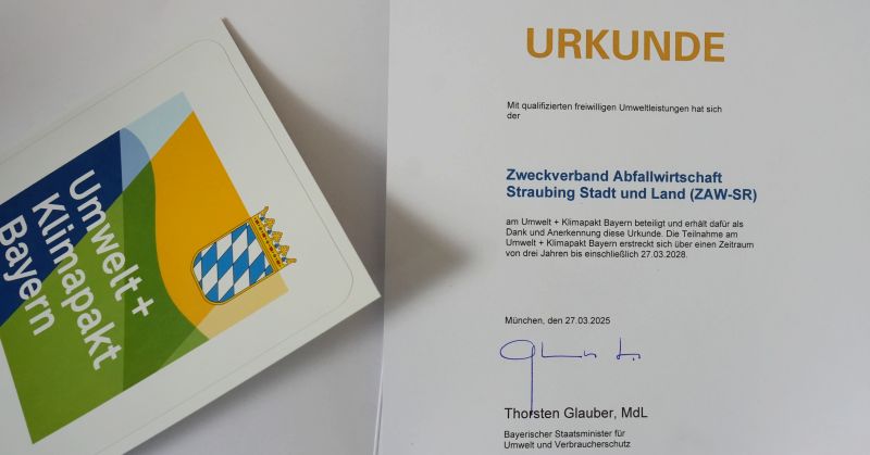 (ra) Der Zweckverband Abfallwirtschaft Straubing Stadt und Land (ZAW-SR) ist neues Mitglied des „Umwelt- und Klimapakts Bayern“. Im Rahmen der Verbandsversammlung überreichten am Dienstag Oberbürgermeister Markus Pannermayr und Landrat Josef Laumer die Urkunde für die Aufnahme – als Anerkennung für das besondere Engagement des ZAW-SR im betrieblichen Umweltschutz.