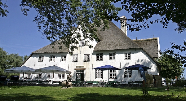 Einen weiteren Haubarg – und auch den sollte man nicht verpassen – gibt es im Norden der Halbinsel. Der Weg führt über stille Straßen; teils behütet durch Baum und Busch, teils exponiert mit weitem Blick und scheinbar verloren in Zeit und Raum. Immer wieder spürt man den Wind (der mit einem Elektroantrieb niemals ärgert), der das Aroma der nahen Nordsee herüberträgt. Kleine Katen ducken sich unter dem hohen Himmel, dann ein gemütliches Gasthaus und hinter Witzwort bald der mächtige Hof auf dem Hügel, der Haubarg. Rot ist er nicht, obwohl er so heißt, es ist trotzdem der Richtige: